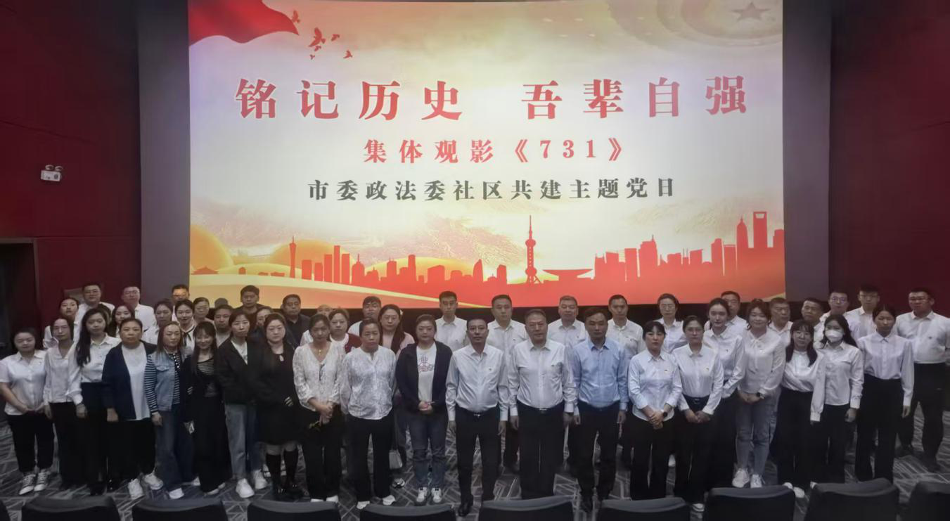 为纪念中国人民抗日战争暨世界反法西斯战争胜利80周年,深入贯彻习近平总书记关于“铭记历史、缅怀先烈、珍爱和平、开创未来”的重要指示精神,引导广大党员干部厚植爱国情怀,市委政法委开展“铭记历史 吾辈自强”社区共建主题党日活动,集体观看爱国主义教育影片《731》。市委政法委机关全体、共建社区部分党员干部共计50余人参加活动。