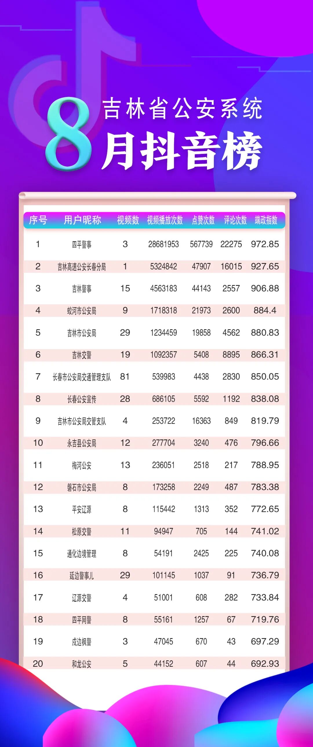 吉林省政法系统抖音2025年8月排行榜来啦!“吉林省戒毒康复所”获得总榜第一名!“四平警事”获得总榜第二名!“延吉法警”获得总榜第三名!