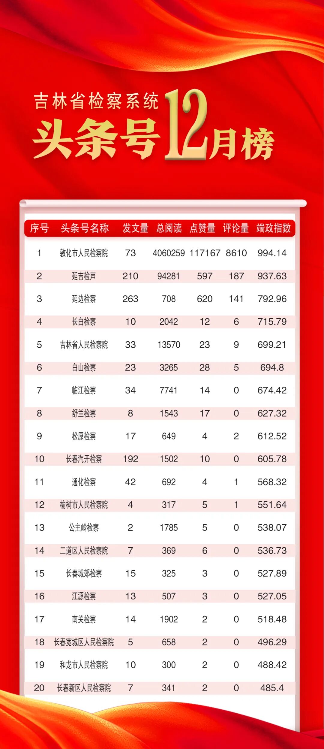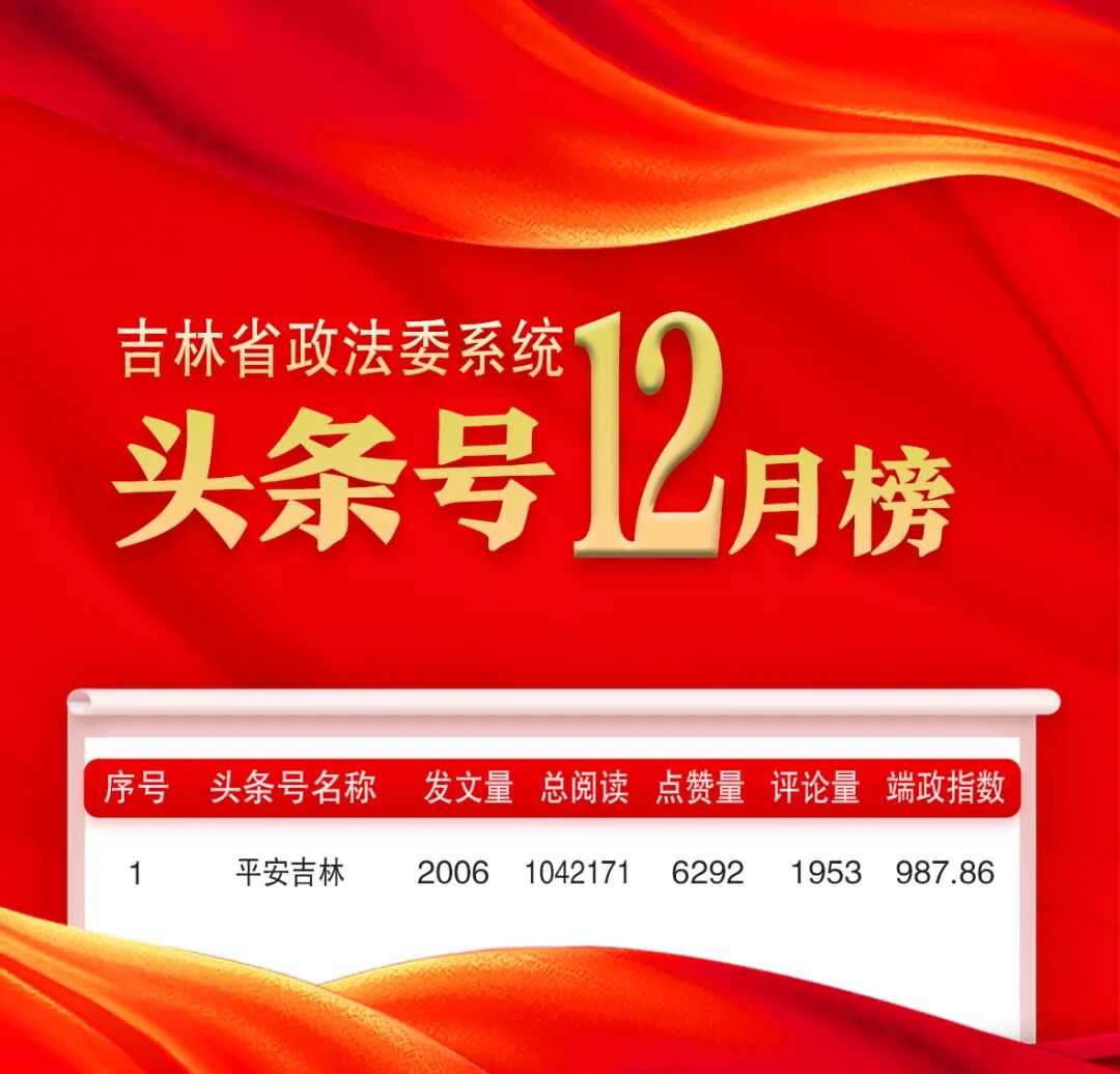 吉林省政法系统头条号2025年12月排行榜已经揭晓,“法治榆树”获得头条号总榜第一名!