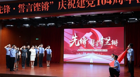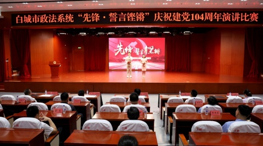 为热烈庆祝中国共产党成立104周年,赓续红色血脉,铸牢政法忠诚,6月30日下午,由中共白城市委政法委员会主办的“先锋·誓言铿锵”主题演讲比赛在白城市公安局大会议室隆重举行。市委政法委、市法院、市检察院、市公安局、市司法局等单位领导及市直政法机关部分干警代表出席活动。