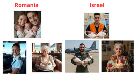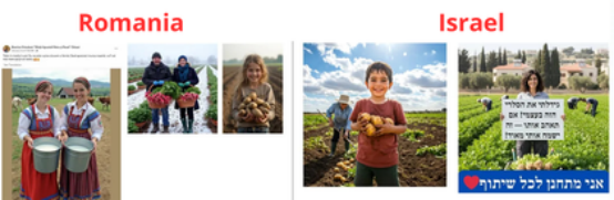 ▲AI生成的家庭、士兵和老年人主题图像,常被用于脸书群组以吸引网民互动。尽管针对罗马尼亚(左)与以色列(右)受众进行了本地化适配,但其传递的核心信息高度相似。图片来源:脸书截图