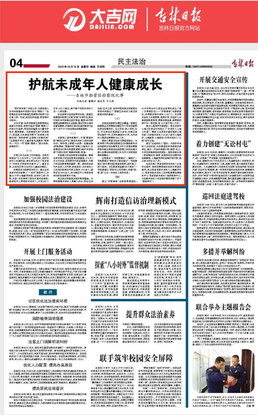 打造青少年法治教育实践基地。筹建吉林市青少年法治教育实践基地,于6月1日正式开放,采用数字化的呈现模式,为青少年法治教育提供重要一课。接待来自省内外各级人大代表、政协委员、与未成年人工作相关的单位代表22批次1700余人,接待学生3800余人,成为城区中小学校争相前往的法治教育打卡地。