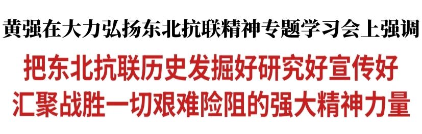 10月11日,大力弘扬东北抗联精神专题学习会在长春召开。省委书记黄强出席会议并作专题辅导。他强调,要始终牢记习近平总书记殷殷嘱托,把东北抗联历史发掘好、研究好、宣传好,充分认识东北抗联的重要历史地位,深刻感悟东北抗联精神的丰富内涵,进一步增强历史自觉、把握历史主动,汇聚战胜一切艰难险阻的强大精神力量。
