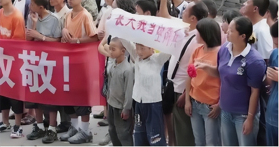 上图为2008年汶川地震后,空降兵救援部队撤离时,程强举着“长大我当空降兵”的标语;下图为参军入伍后的程强。