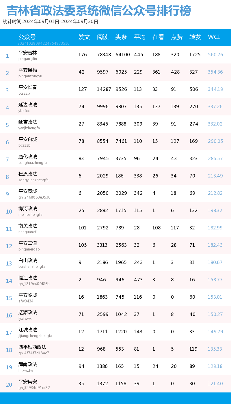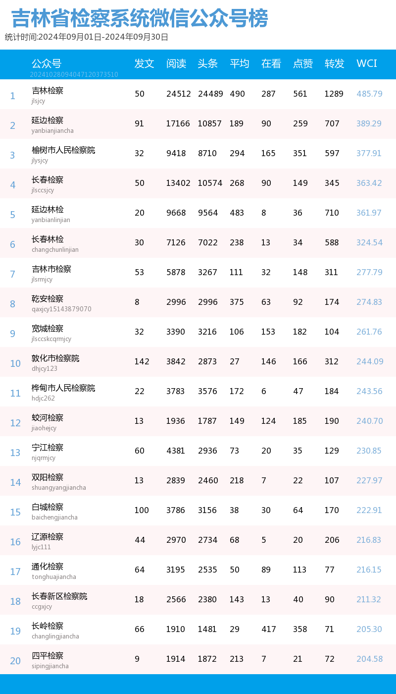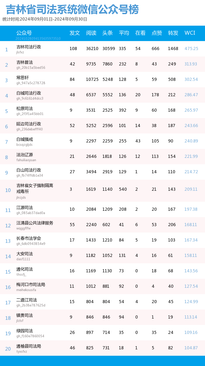 “讲述政法好故事、传播吉林好声音”。我省政法系统以新媒体平台为阵地,记录全省各政法单位为民服务的点滴,也记录吉林沃土上的法治化进程。也因此,打造了一大批优秀政法新媒体品牌,“百花齐放春满园”的盛景真正展现了“百花齐放、百家争鸣”的新气象。北方法制报以第三方数据平台清博指数的统计数据为依据,推出了政法新媒体2024年9月榜单,本次榜单统计周期为2024年9月1日-9月30日。