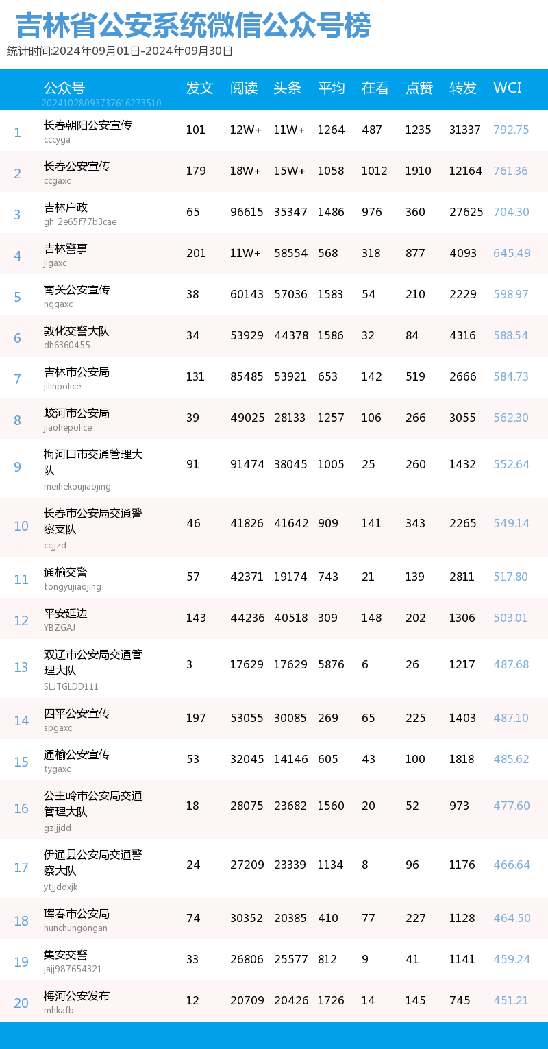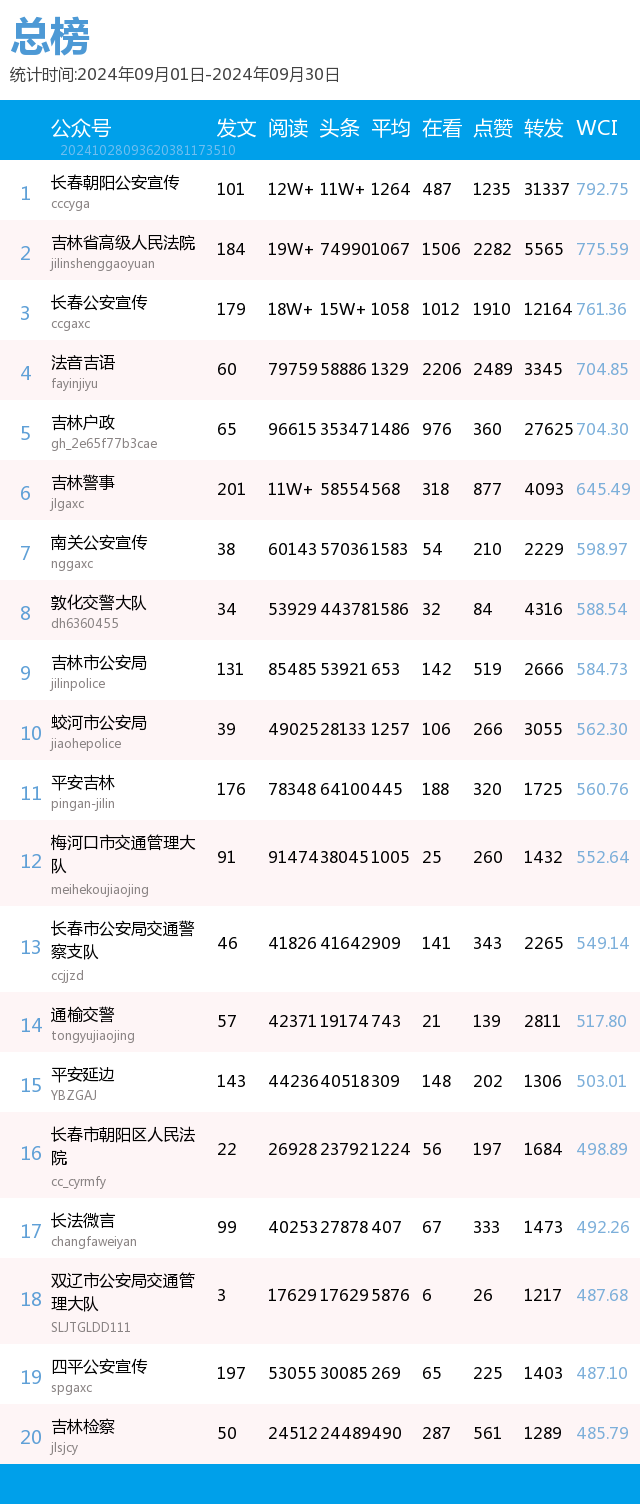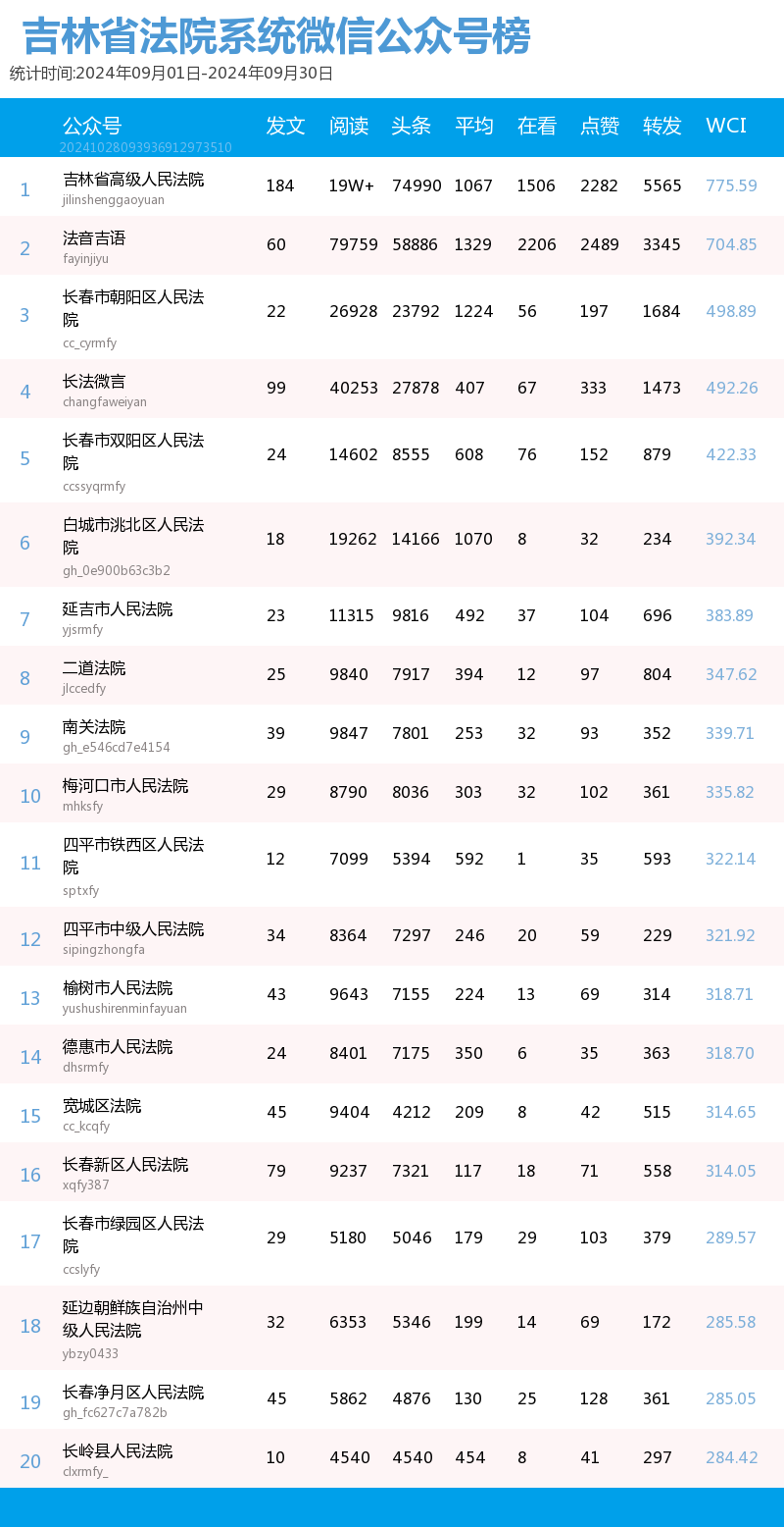 “讲述政法好故事、传播吉林好声音”。我省政法系统以新媒体平台为阵地,记录全省各政法单位为民服务的点滴,也记录吉林沃土上的法治化进程。也因此,打造了一大批优秀政法新媒体品牌,“百花齐放春满园”的盛景真正展现了“百花齐放、百家争鸣”的新气象。北方法制报以第三方数据平台清博指数的统计数据为依据,推出了政法新媒体2024年9月榜单,本次榜单统计周期为2024年9月1日-9月30日。
