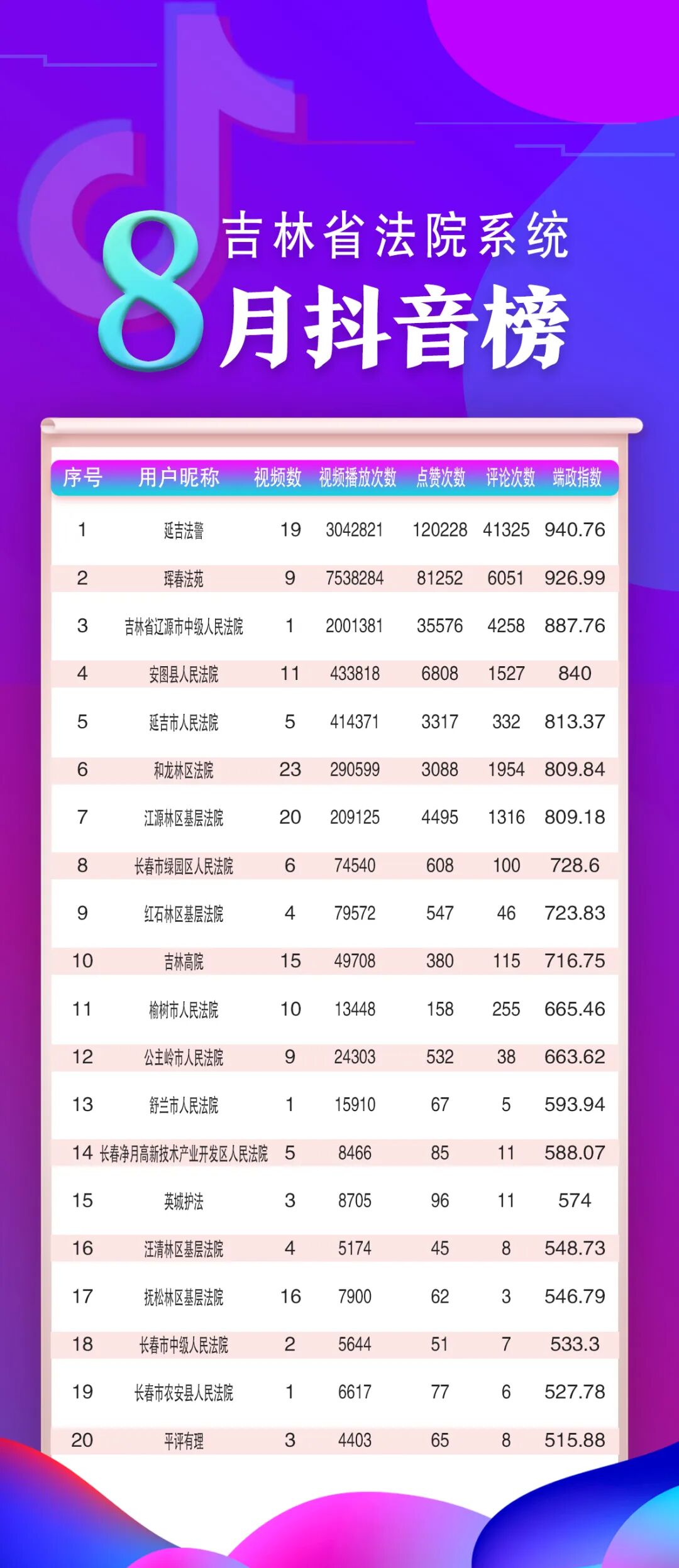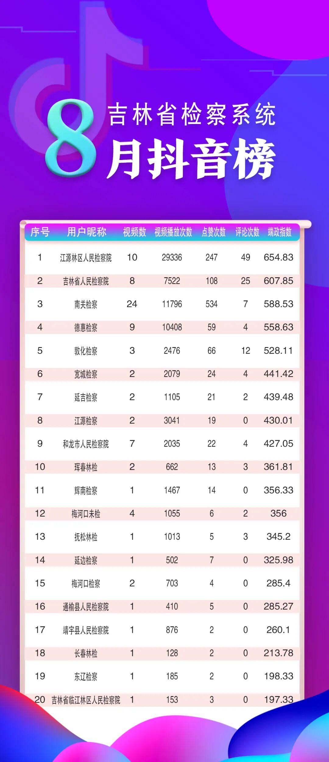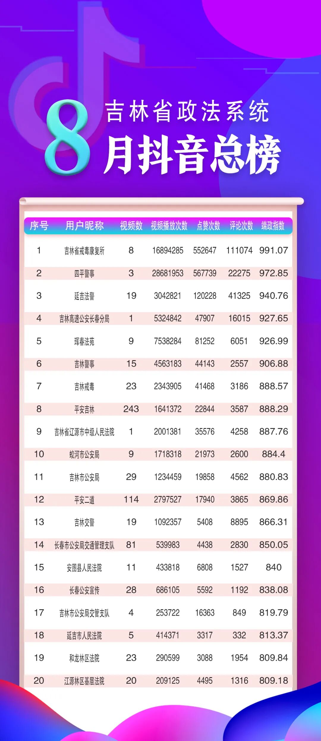 吉林省政法系统抖音2025年8月排行榜来啦!“吉林省戒毒康复所”获得总榜第一名!“四平警事”获得总榜第二名!“延吉法警”获得总榜第三名!