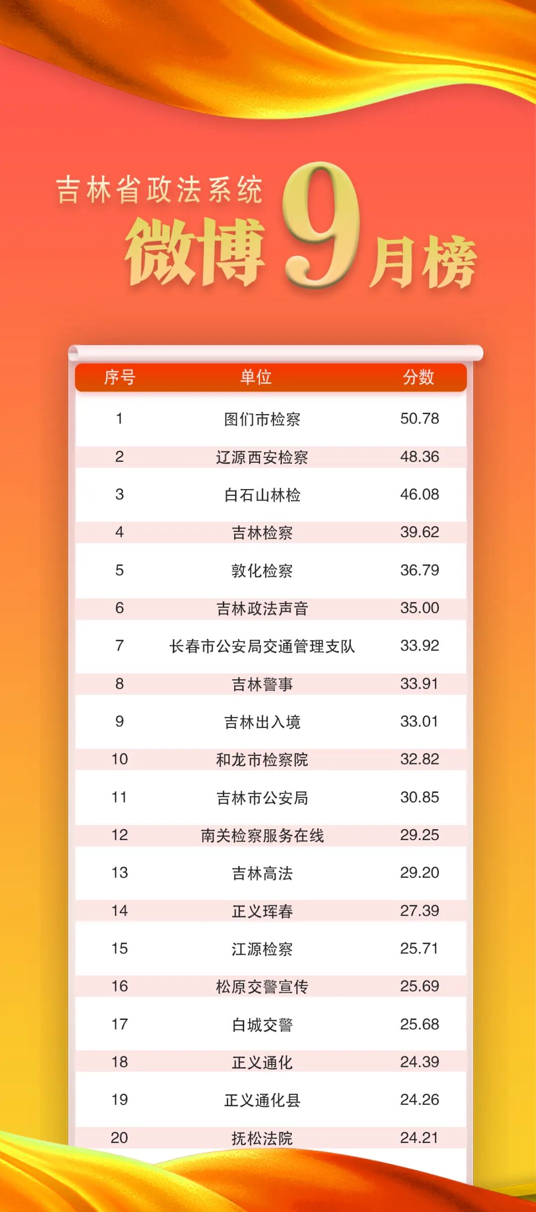 吉林省政法系统微博2025年9月排行榜已经出炉,“图们市检察”获得第一名!“辽源西安检察”获得第二名,“白石山林检”获得总榜第三名,恭喜!