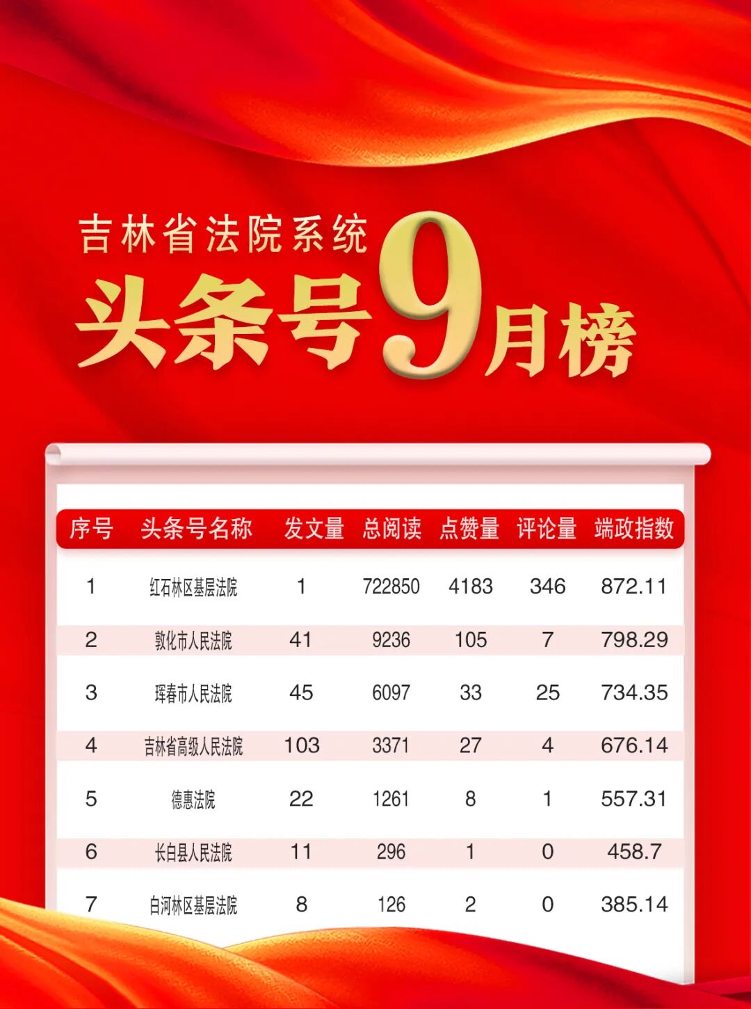 吉林省政法系统头条号2025年9月排行榜已经揭晓,“敦化市人民检察院”获得头条号总榜第一名!