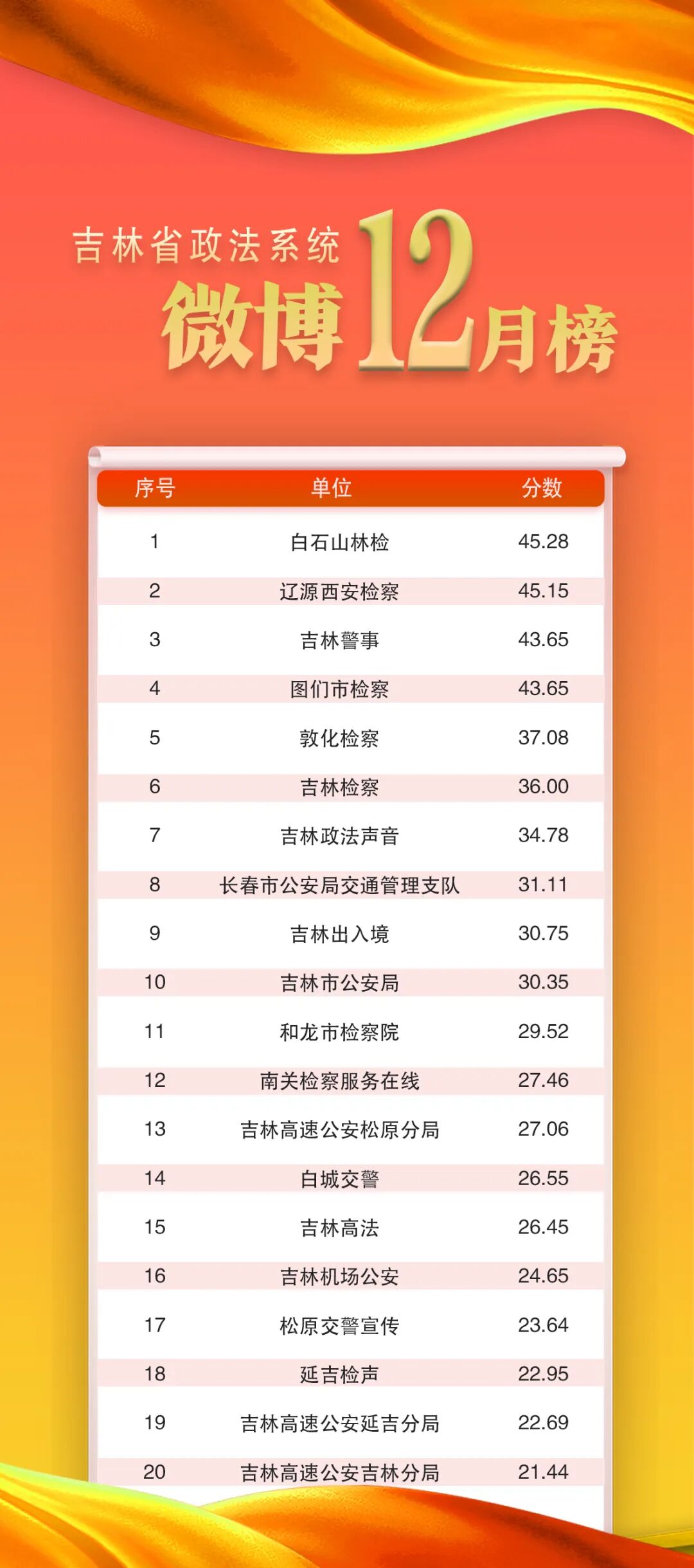 吉林省政法系统微博2025年12月排行榜已经出炉,“白石山林检”获得第一名!“辽源西安检察”获得第二名,“吉林警事”与“图们市检察”并列获得总榜第三名,恭喜!