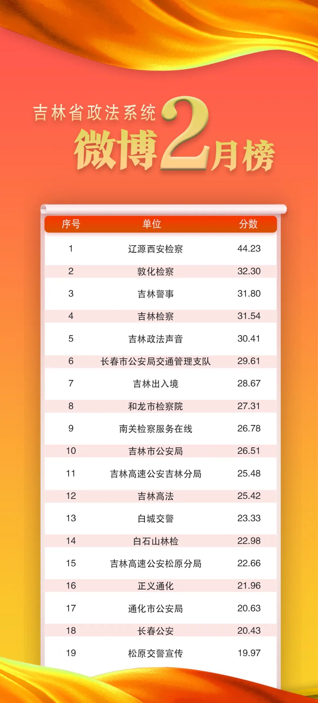 吉林省政法系统微博2026年2月排行榜已经出炉,“辽源西安检察”获得第一名!“敦化检察”获得第二名,“吉林警事”获得总榜第三名,恭喜!