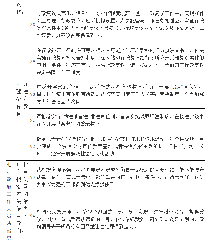 (四)强化支持保障。各地区要加大对示范地区的支持力度,在经济社会发展政策上给予倾斜,在有关督察考核中简化任务要求,在相同条件下优先提拔使用法治素养好、依法办事能力强的干部,并可以视情对示范地区以及作出突出贡献的人员进行表彰。中央依法治国办在开展重要改革试点、干部培训交流、先进单位或者人员表彰等方面工作时,优先考虑示范地区,加强支持和保障。
