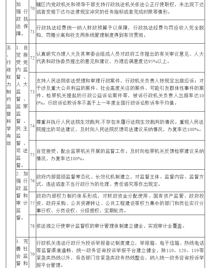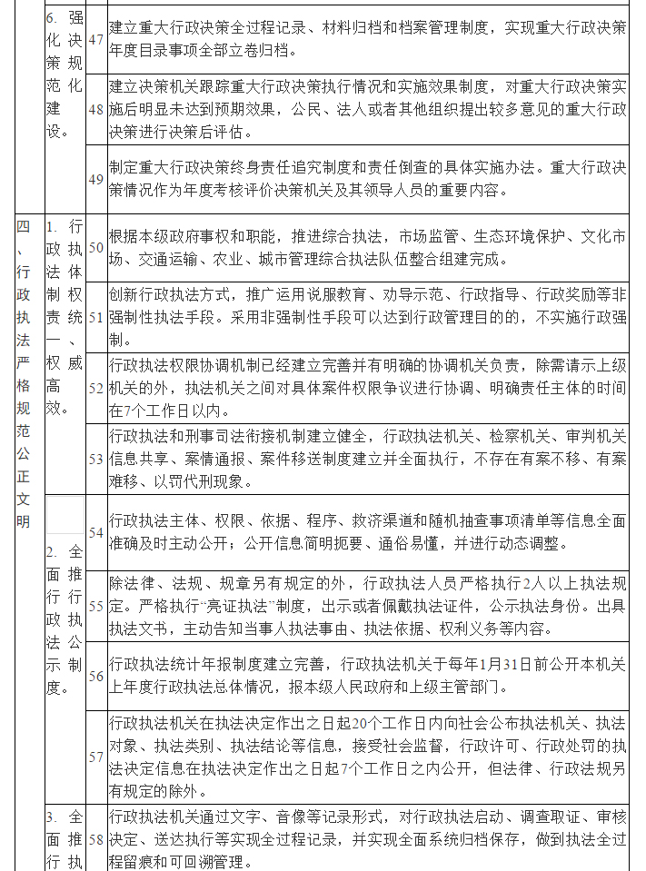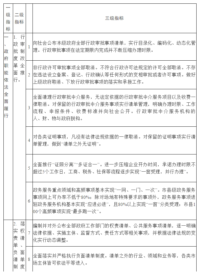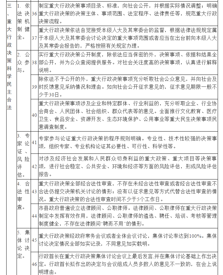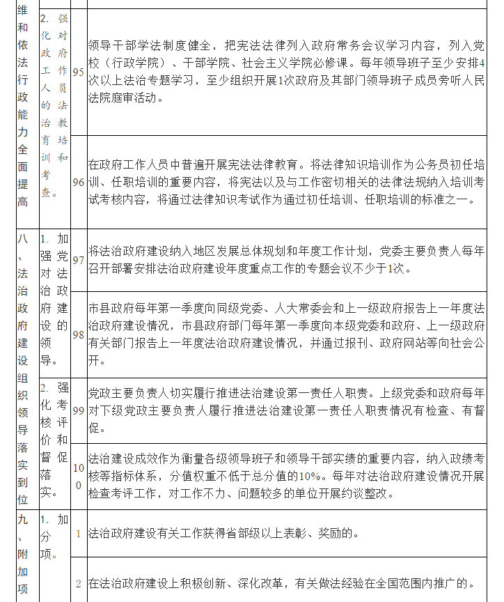 根据《中共中央关于全面推进依法治国若干重大问题的决定》《法治政府建设实施纲要(2015—2020年)》以及党中央、国务院关于法治政府建设的一系列重要文件,总结各省(区、市)实施法治政府建设考核评价指标体系的成功经验,坚持问题导向、目标导向,突出针对性、引领性、可操作性,制定《市县法治政府建设示范指标体系》(以下简称指标体系),作为开展示范创建活动的评估标准,作为建设法治政府的具体指引,使法治政府建设可量化、可证明、可比较。指标体系各项指标的分值、权重和评测方式由中央依法治国办组织专家研究确定。根据党中央、国务院关于法治政府建设的最新决策部署和实践发展,按照示范创建活动周期,每两年对指标体系进行一次更新、调整和优化。