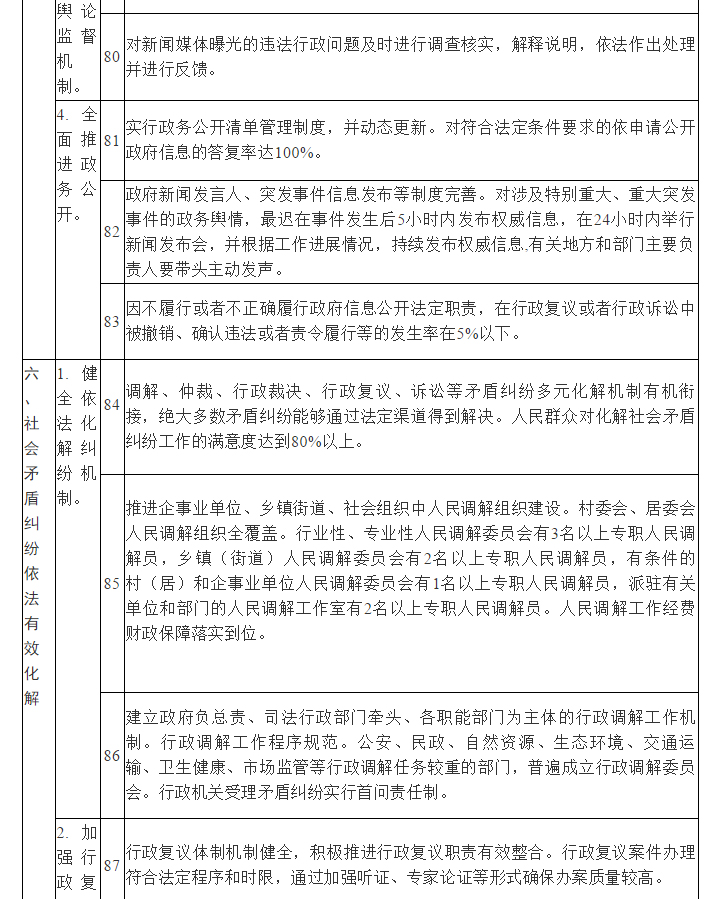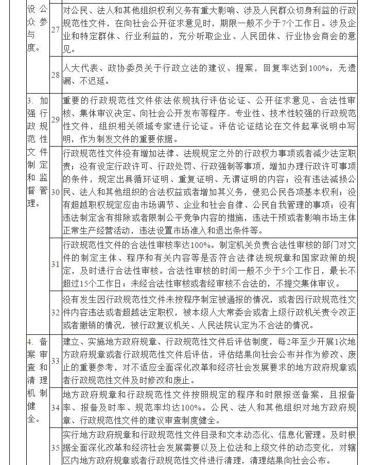 (三)创建目标。从2019年启动第一批法治政府建设示范地区评估认定开始,每两年开展一次,梯次推进,树立一批批新时代法治政府建设的新标杆,形成样板效应,营造法治政府建设创优争先的浓厚氛围,开创法治政府建设新局面;创造最能聚人聚财、最有利于发展的法治化营商环境,激发市场主体活力,增进人民群众便利,为统筹推进“五位一体”总体布局、协调推进“四个全面”战略布局提供坚实法治保障;深化依法治国实践,加快建设社会主义法治国家,推动到2035年实现法治国家、法治政府、法治社会基本建成的奋斗目标。