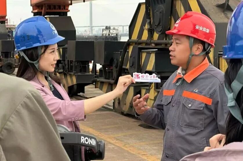 2025年12月,《检察日报》全媒体记者(左一)在广东省广州市黄埔港采访全国人大代表周冲。