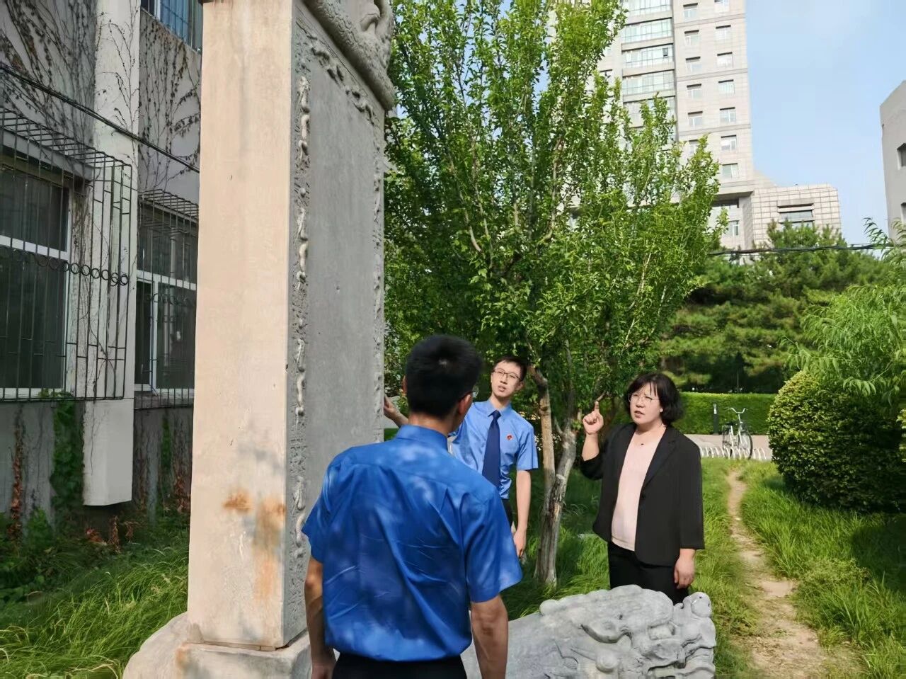《检察日报》全媒体记者(右一)和北京市海淀区检察院检察官走访散落在北京师范大学曦园园区内的石碑。