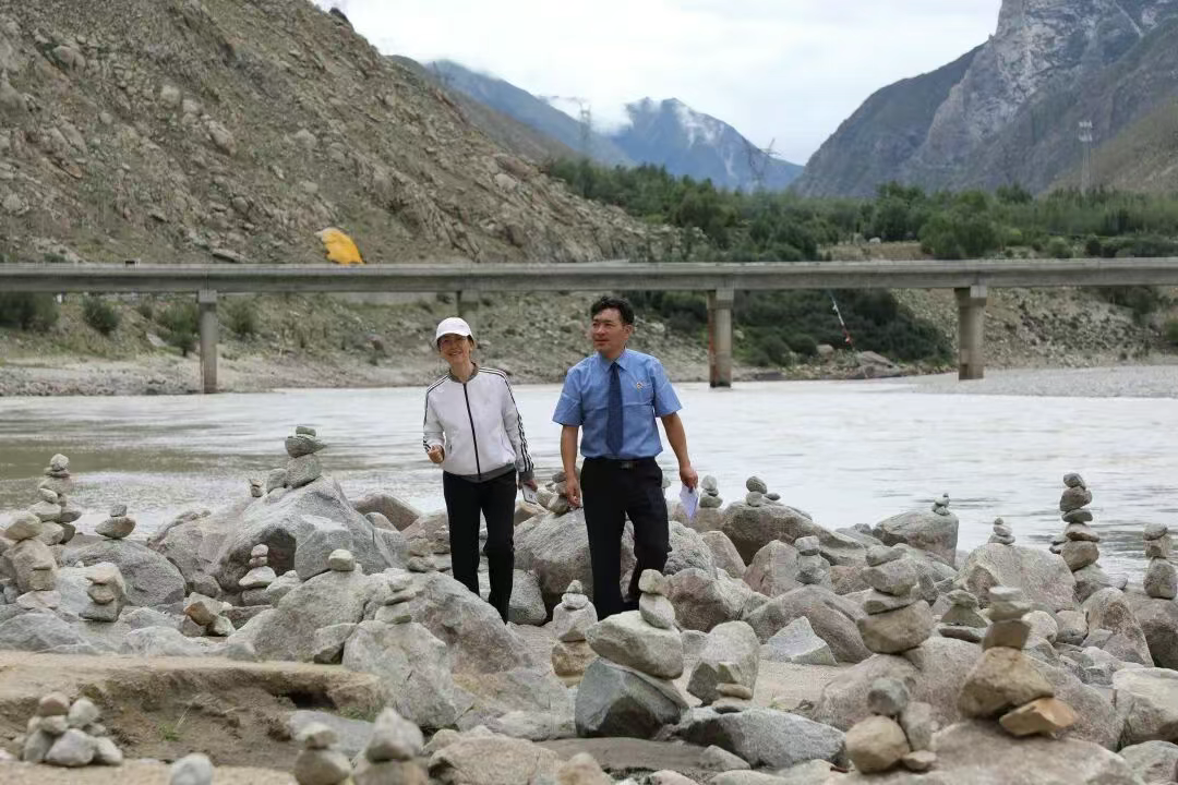 《检察日报》全媒体记者(左一)在西藏自治区拉萨市尼木县采访时,检察官讲述检察公益诉讼保护摩崖石刻雕像的故事。